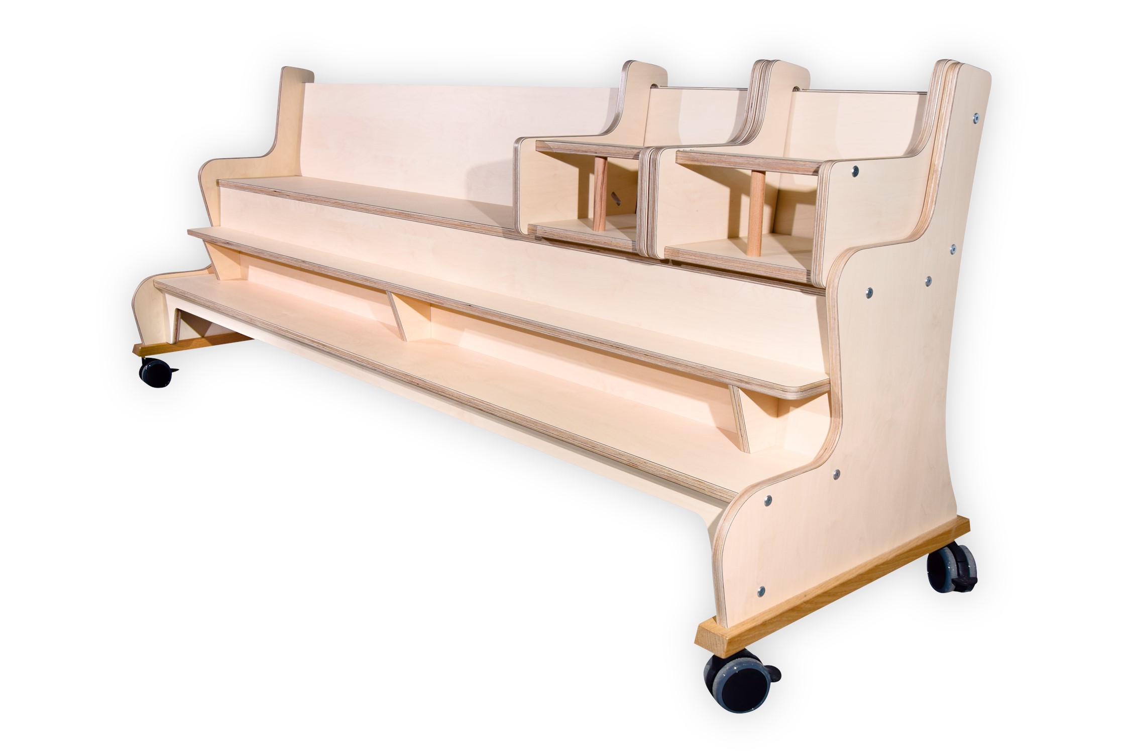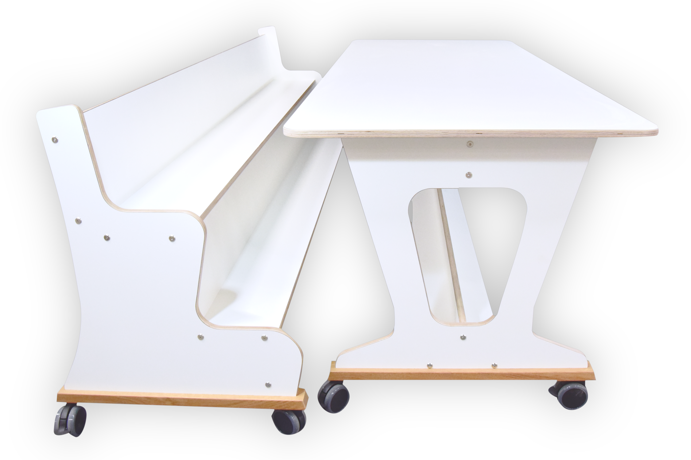 Standaard zijn 4 zwenkwielen voorzien van remmen gemonteerd op massief eiken sloffen..