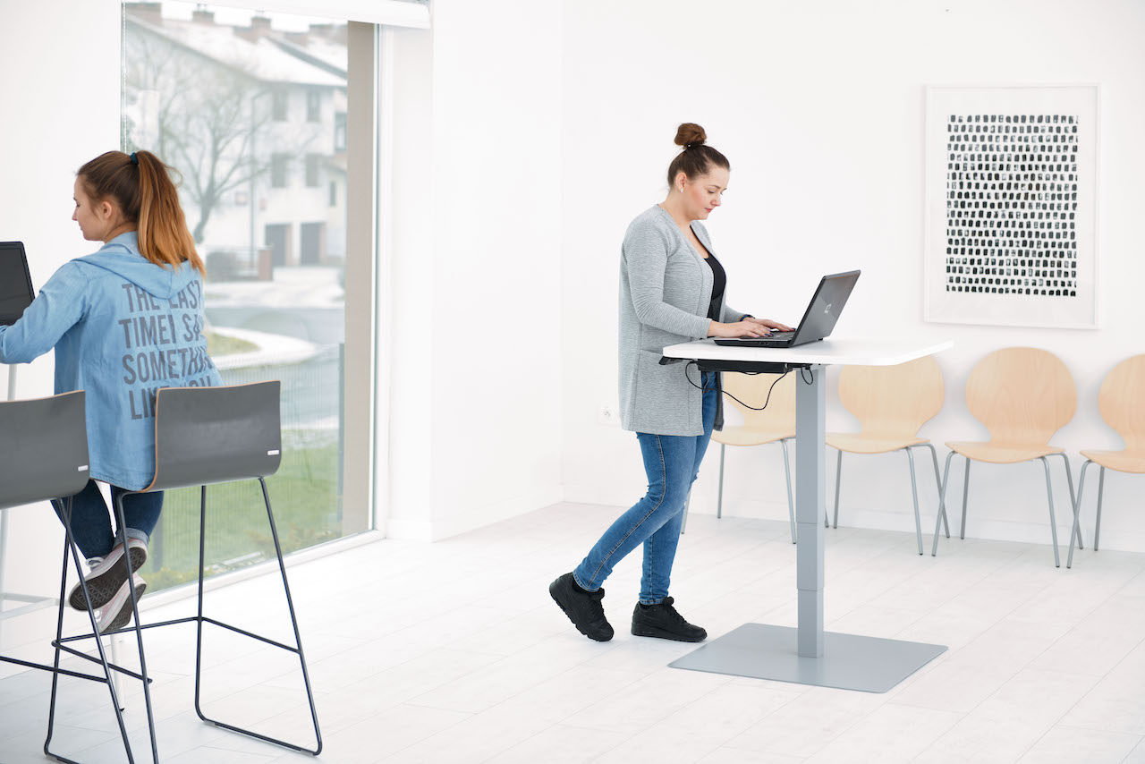 Ronde stabiele tafel met vierkante poten met soepele elektrische hoogteverstelling.