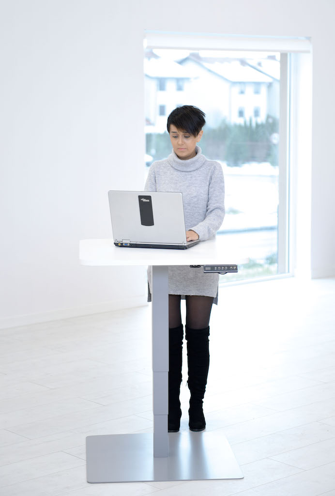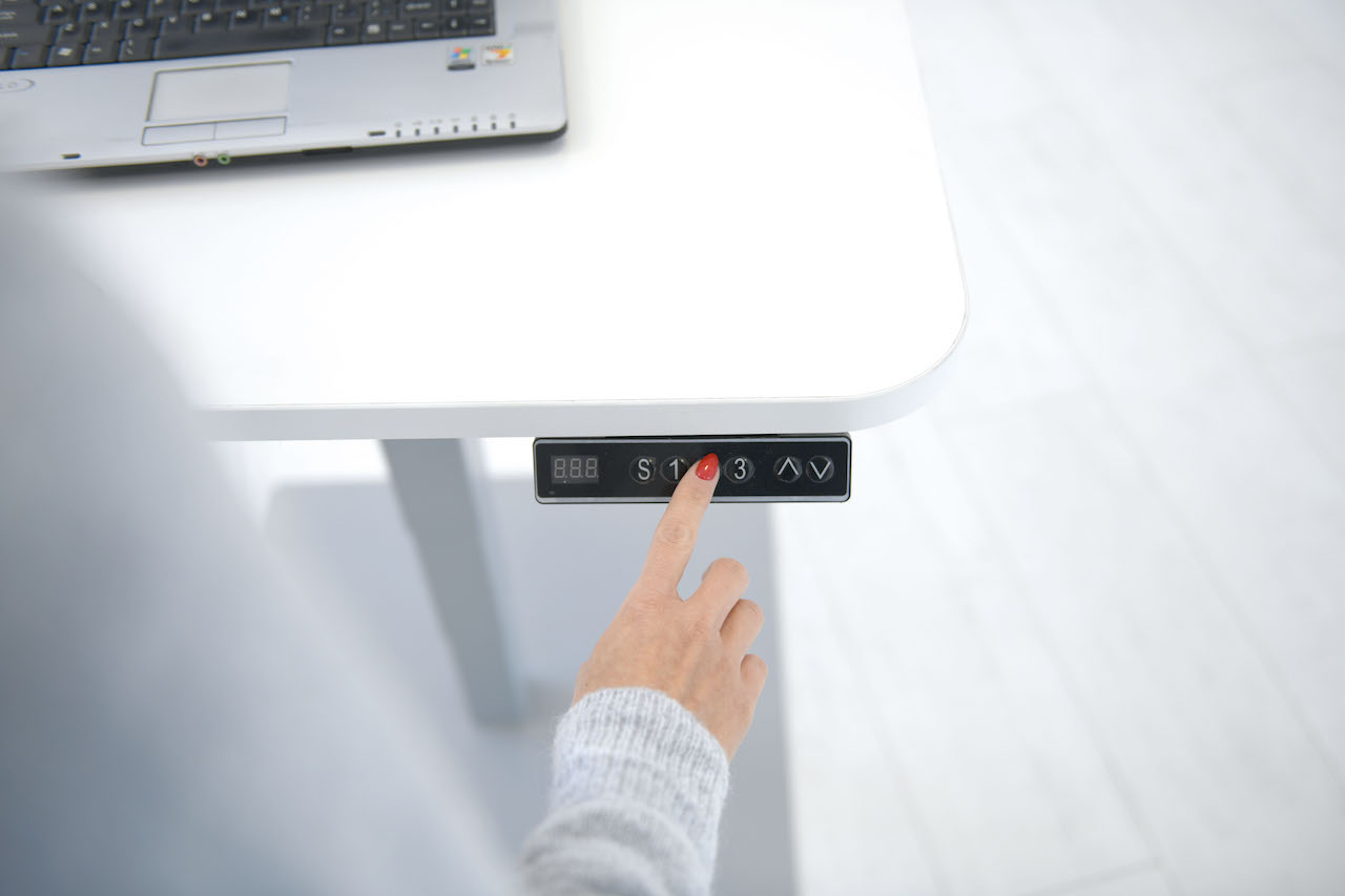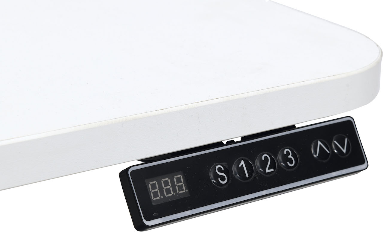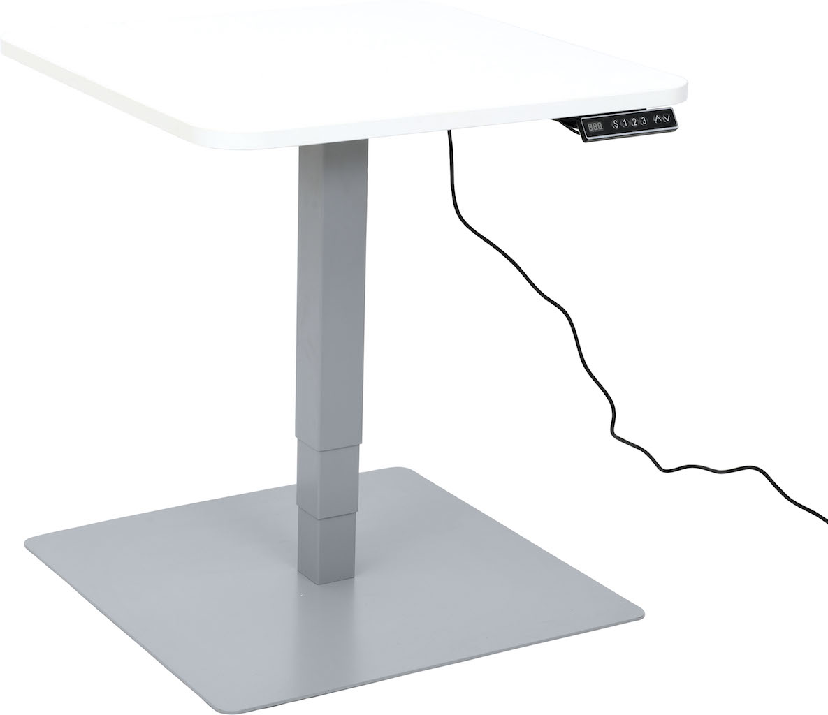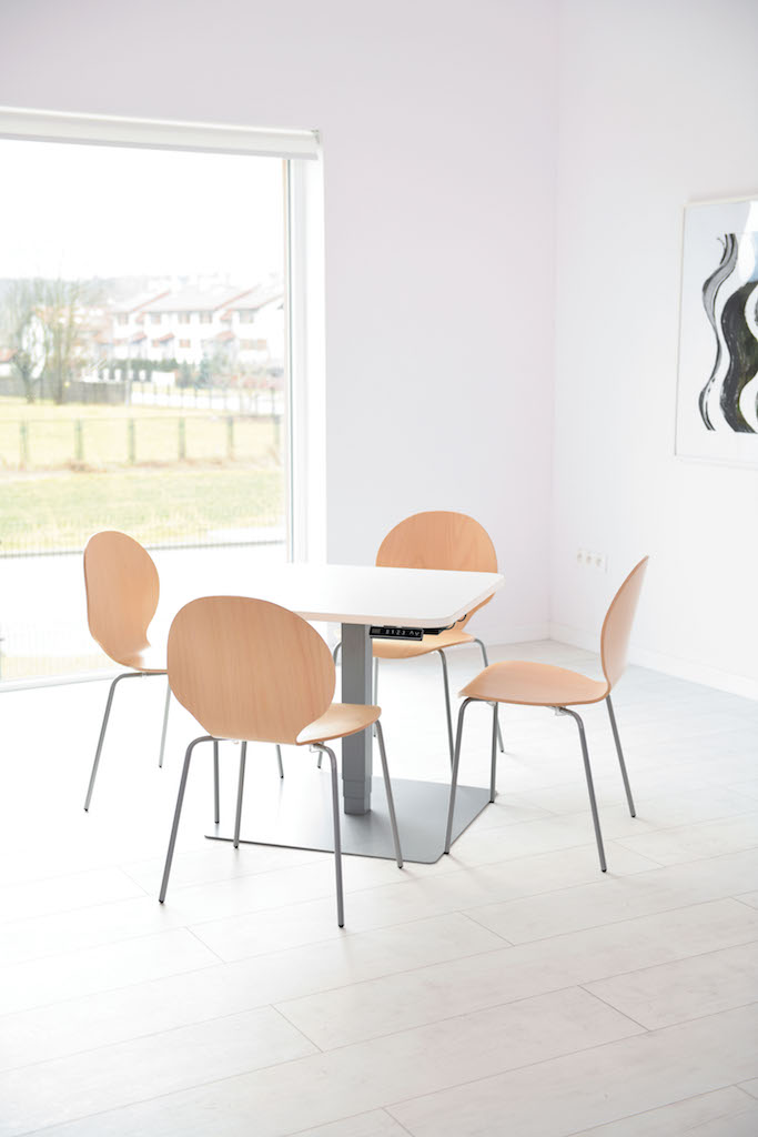 Vierkante stabiele tafel met vierkante poten met soepele elektrische hoogteverstelling.